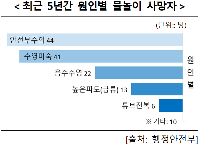 안전부주의: 44명, 수영미숙: 41명, 음주수영: 22명, 파도나 급류에 휩쓸려 발생: 13명, 튜브전복: 6명으로 집계되어 수영미숙이나 음주수영보다 물놀이 중에 떠내려가는 물건을 잡으려고 무리하게 따라가는 등의 안전 부주의가 가장 높은 사망 원인으로 밟혀졌습니다. 물놀이 중에는 무리하지 않아야 하고, 음주 후 물놀이는 절대 금지이며, 자신의 능력을 과신하여 무리한 경쟁과 행동도 지양해야 합니다.