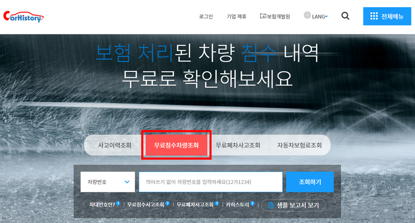 카히스토리 사이트에 접속하셔서 "무료침수차량조회" 메뉴를 클릭하고, 차량의 침수여부를 확인할 수 있습니다.여기에서 무료침수사고조회는 자동차보험 사고자료를 기반으로 차량의 침수사고 발생여부을 제공하는 서비스로서, 다시 말해 자동차를 운행하던 중 자동차 내부로 물이 들어와 시동이 꺼지거나, 주차 중 엔진 등에 물이 들어가 운행이 불가능하게 되어 자동차에 손해가 발생한 경우입니다.